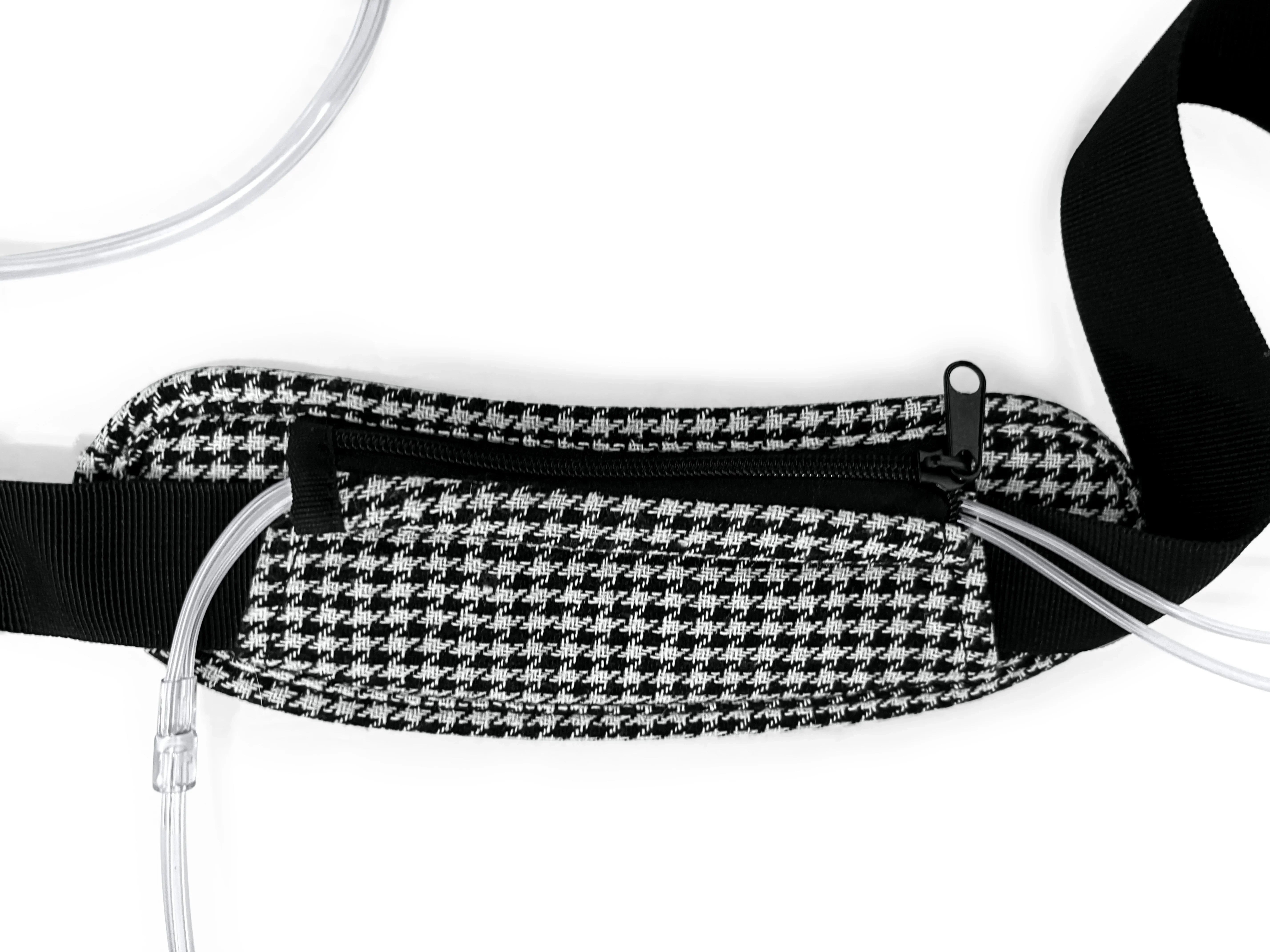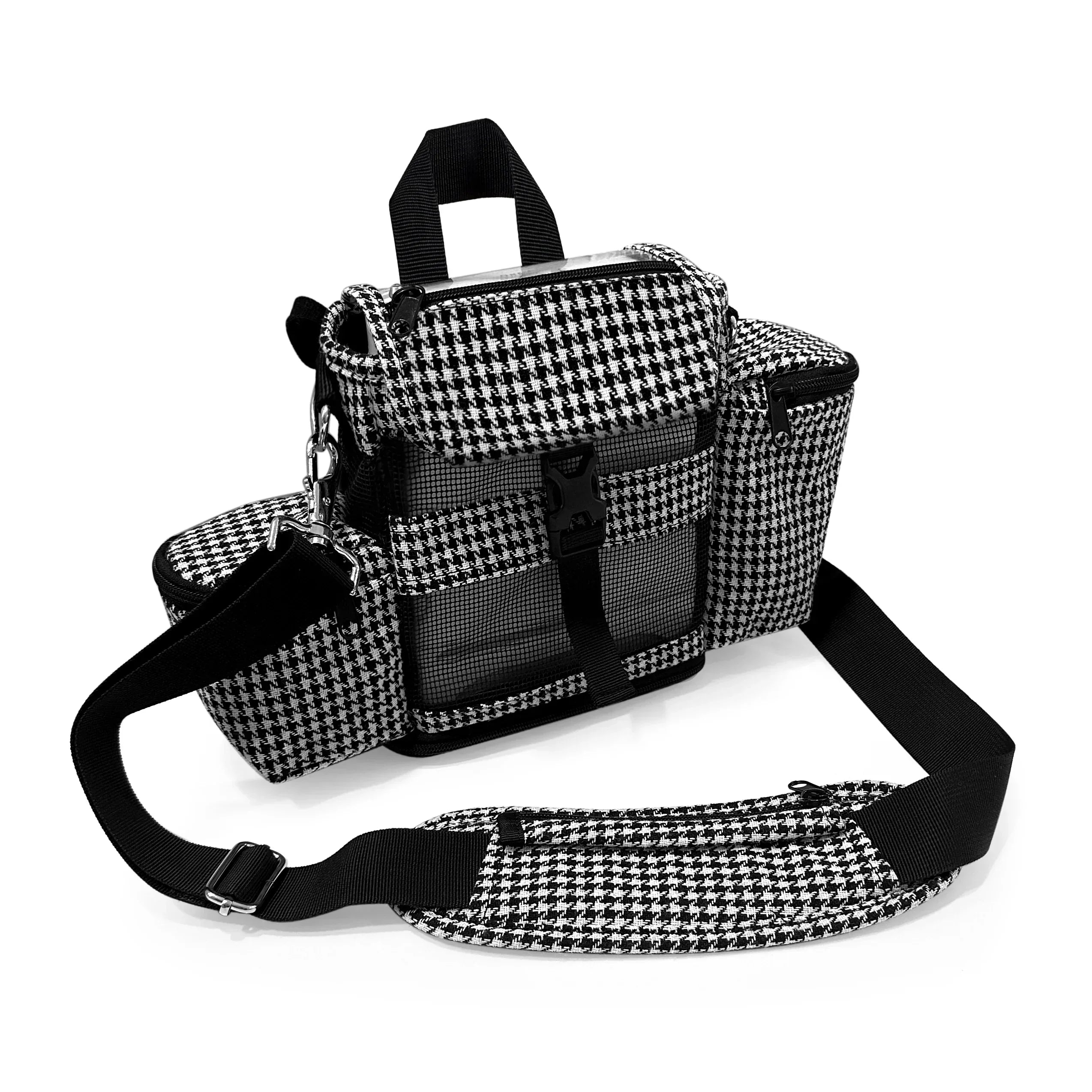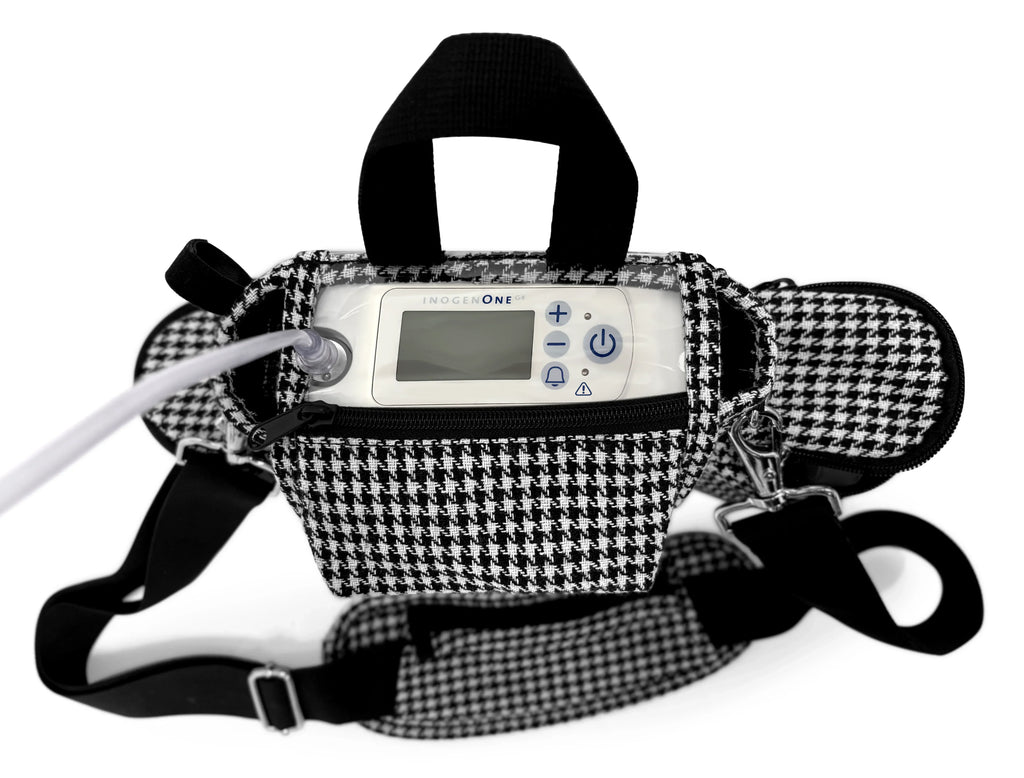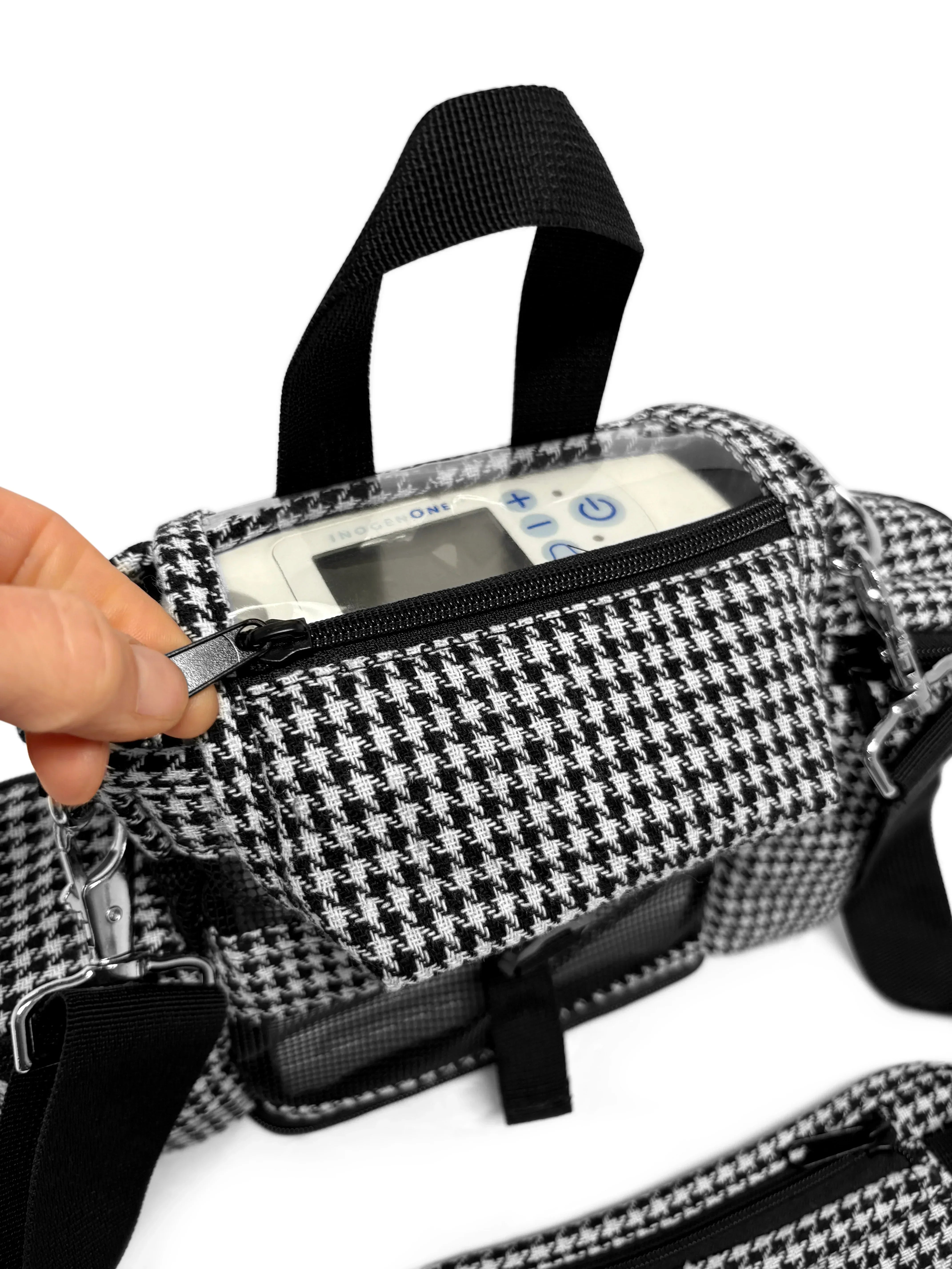 The Carry Bag fit For the OxyGo Fit Poc is designed to provide users with a lightweight, breathable, and stylish bag for their device. Featuring a beautiful houndstooth fabric, an adjustable padded shoulder strap with cannula holder, and a secure pocket for the Inogen Rove 4, it is perfect for keeping your device safe and within reach. With extra pockets for batteries and accessories, charging port on the back, and a zippered bottom for easy battery changes, this carry bag is a reliable and practical choice.