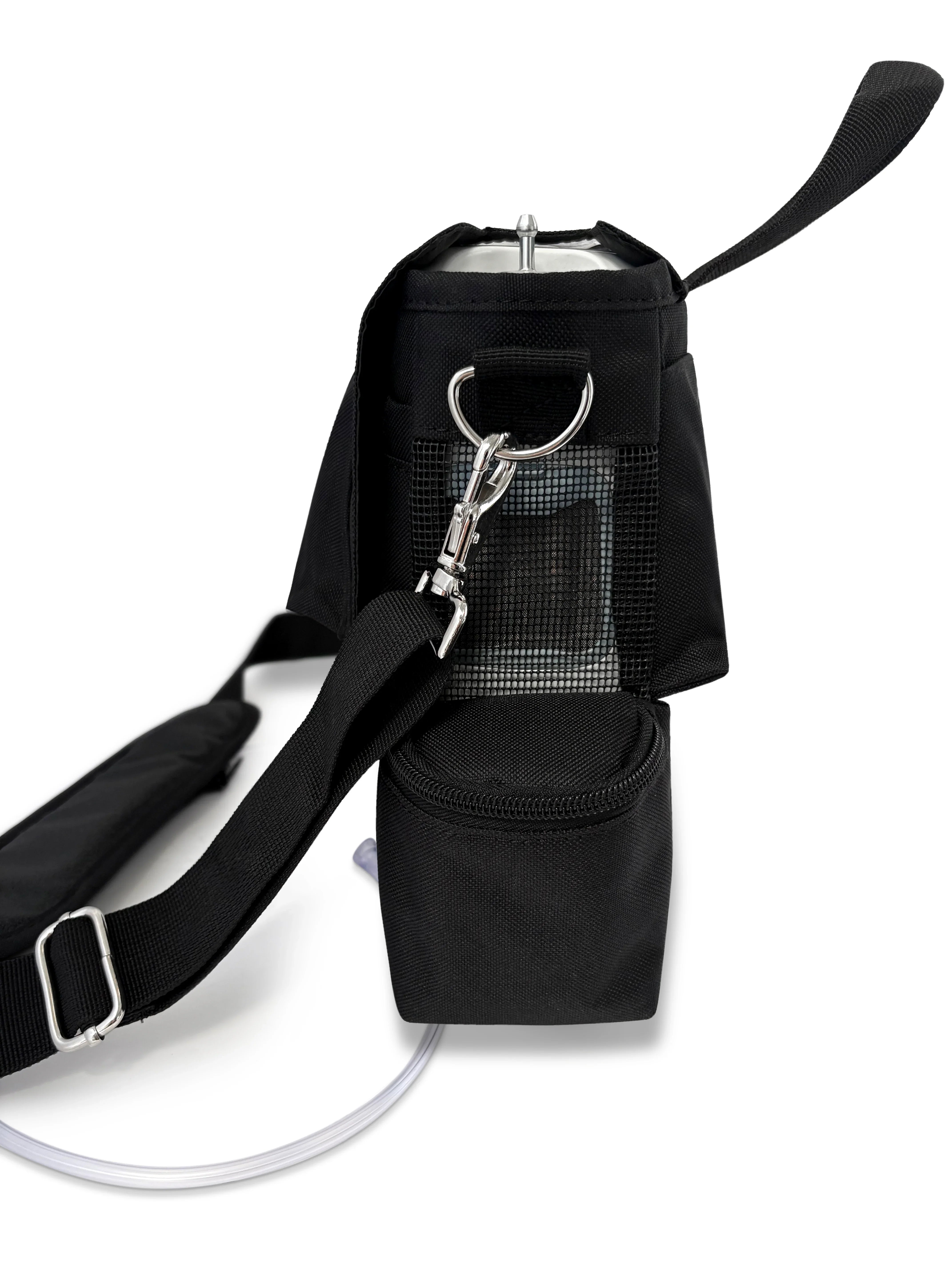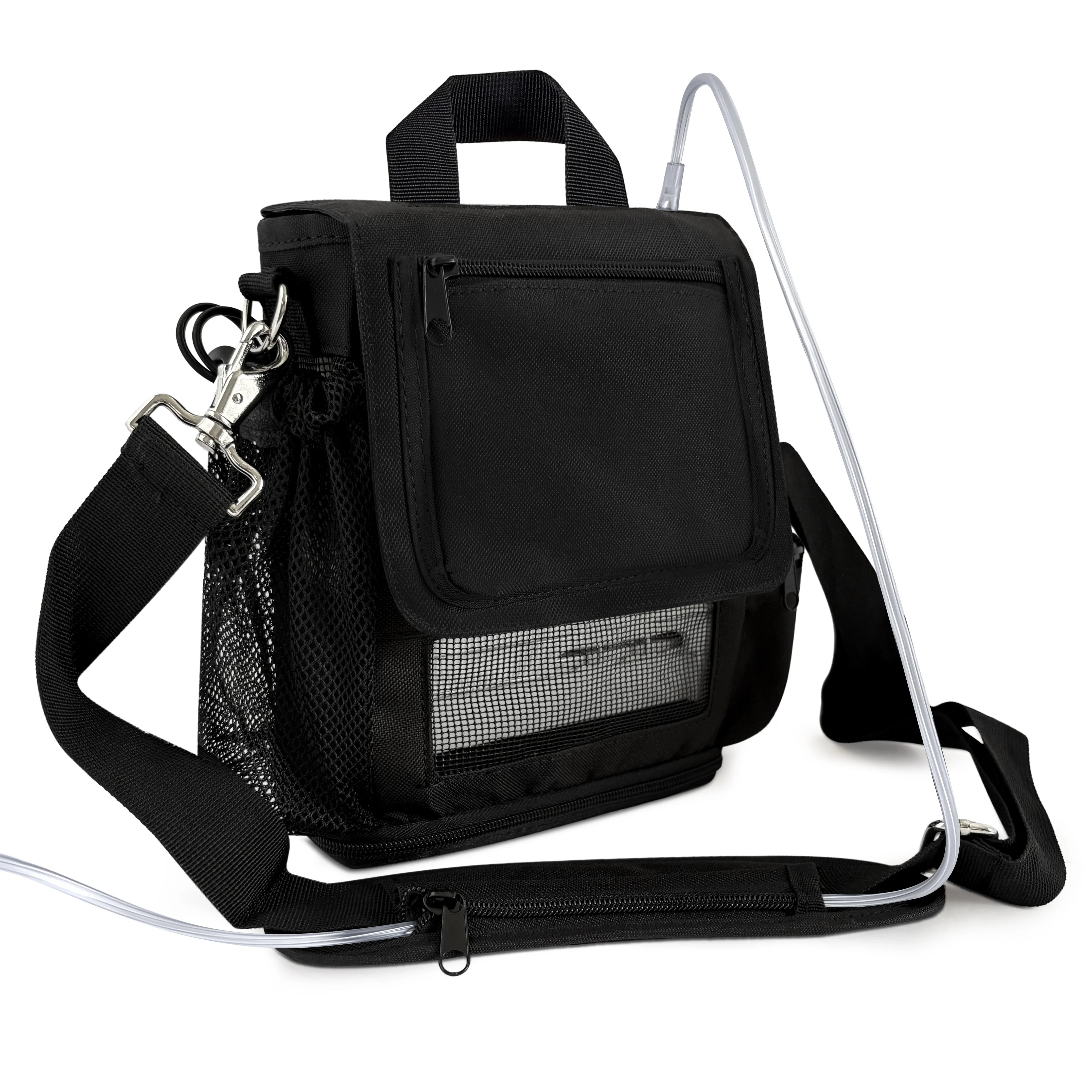 Worried about your cannula? Your cannula is safe with the zipper compartment on the carry strap that attaches your cannula to keep it safe from dragging. Charge your unit in the carry bag with the open access to your charging port, plus, extra pockets, mesh panels, adjustable strap with padded shoulder, and zippered bottom to easily take battery on and off. Perfect for anyone in the house or out!