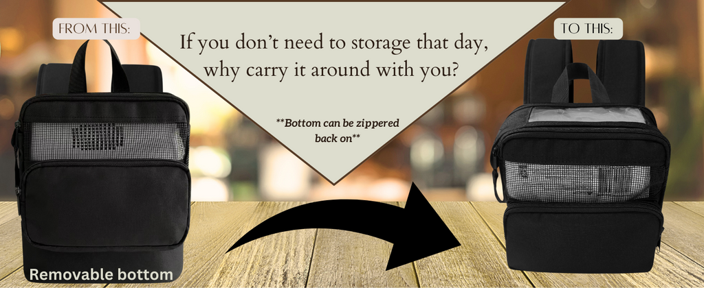 Bottom Compartment: 6.3-width, 3.3-depth, 3" height Can come completely off and zipped back on.