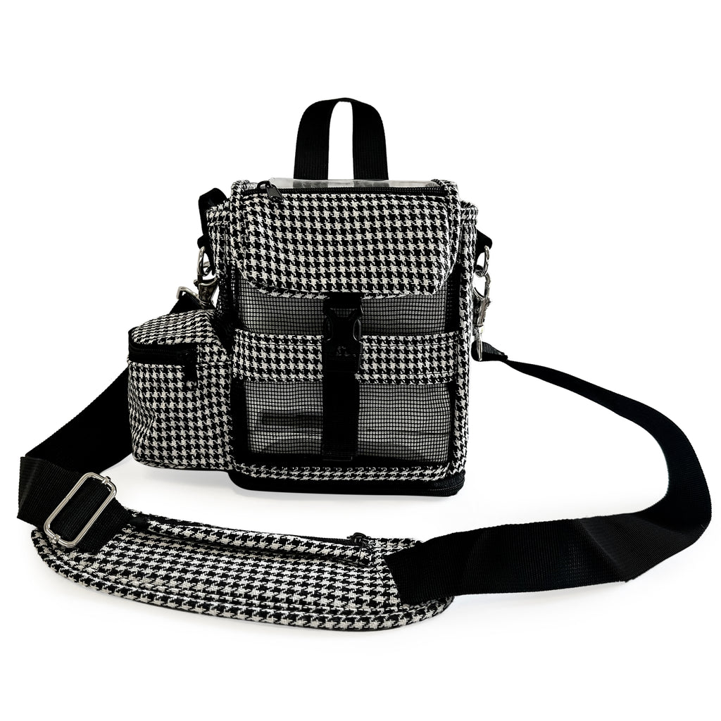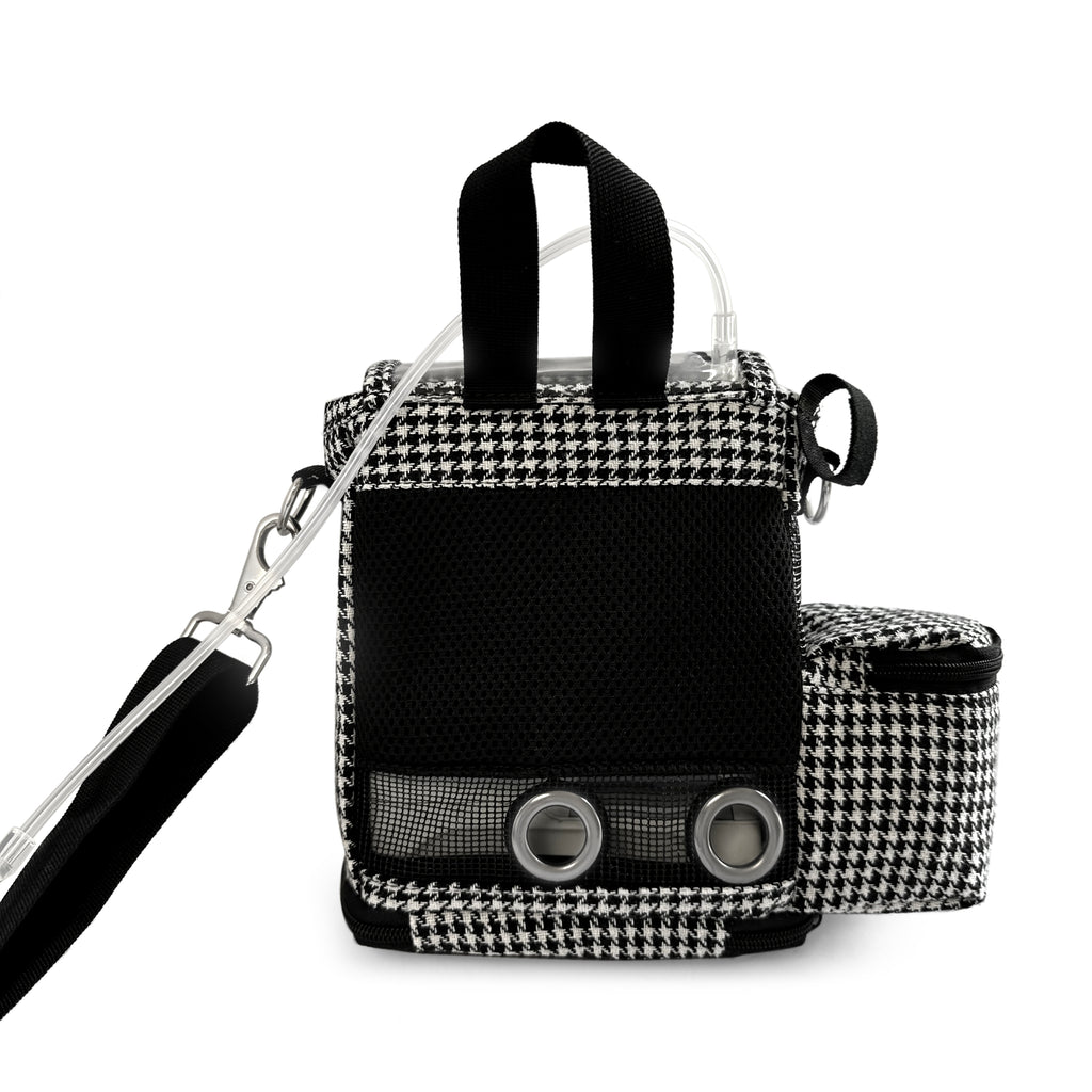 The Carry Bag Fit For Inogen One G4 is designed to provide users with a lightweight, breathable, and stylish bag for their device. Featuring a beautiful houndstooth fabric, an adjustable padded shoulder strap with cannula holder, and a secure pocket for the Inogen G4, it is perfect for keeping your device safe and within reach. With extra pockets for batteries and accessories, charging port on the back, and a zippered bottom for easy battery changes, this carry bag is a reliable and practical choice.