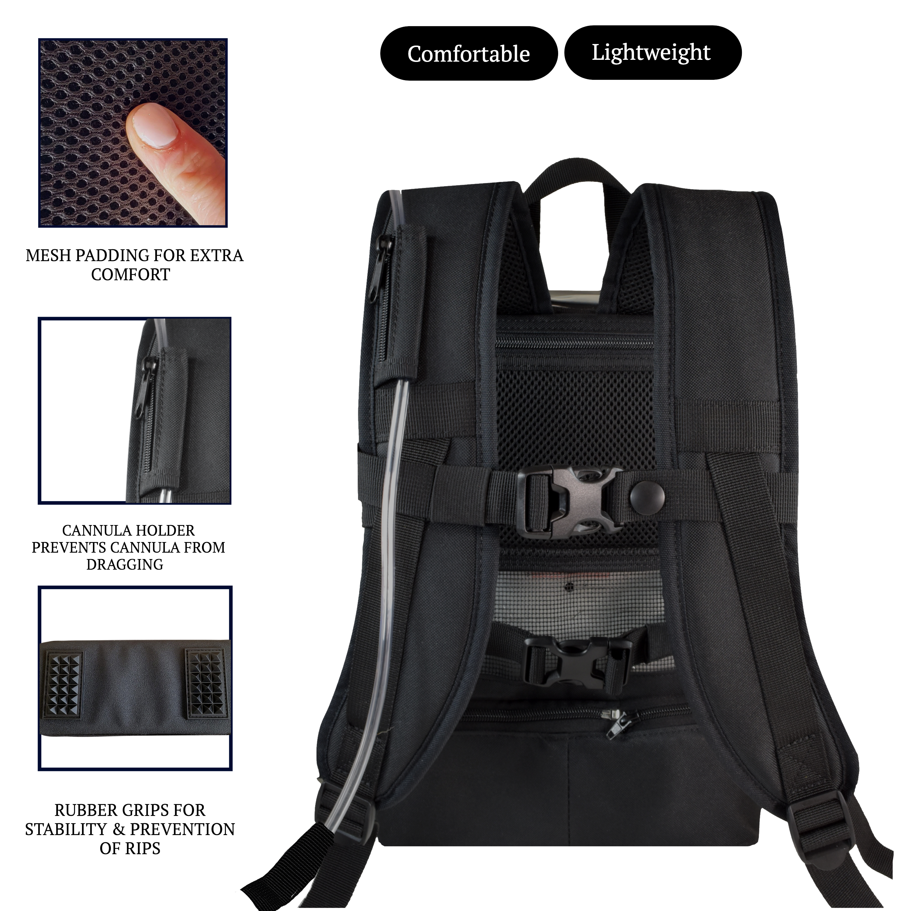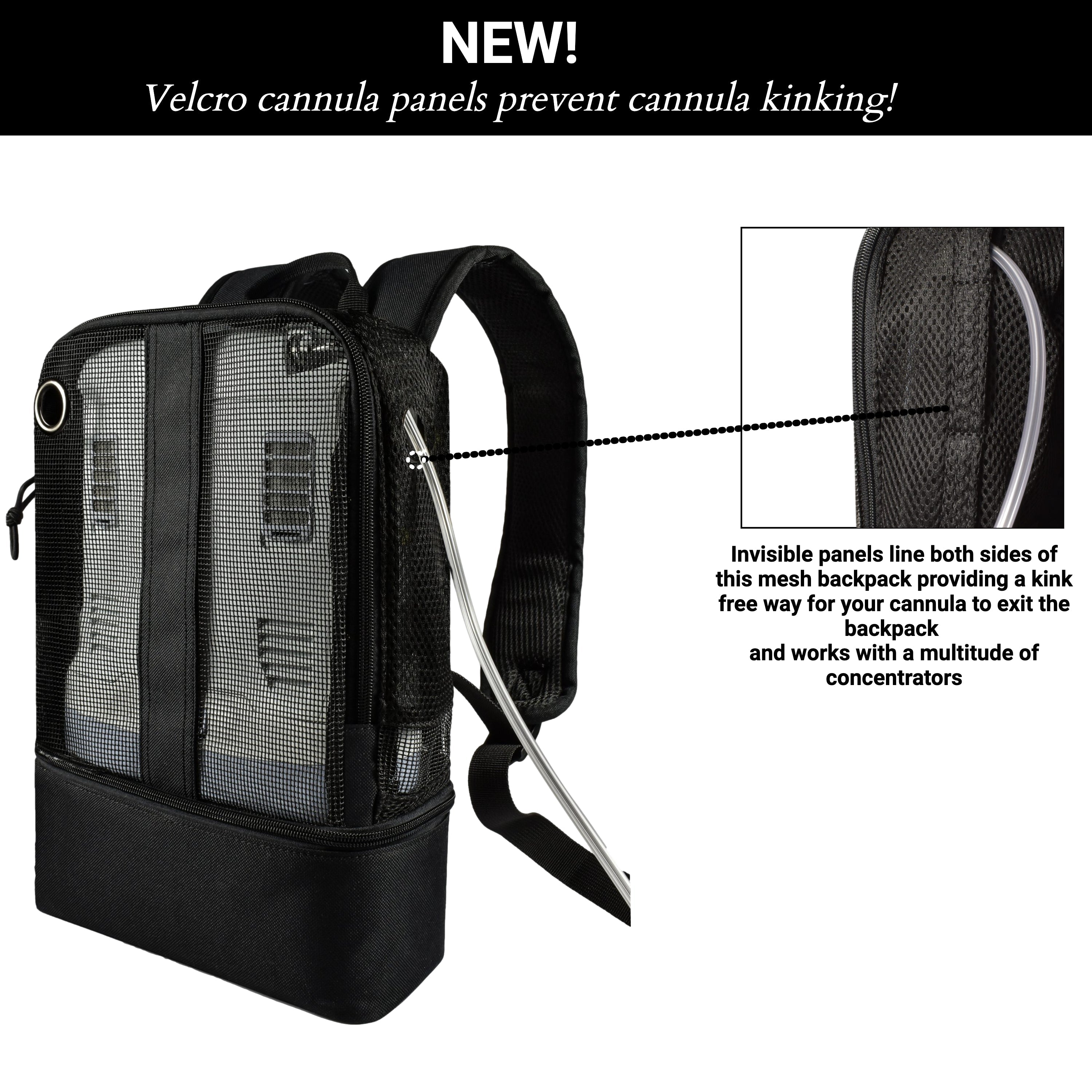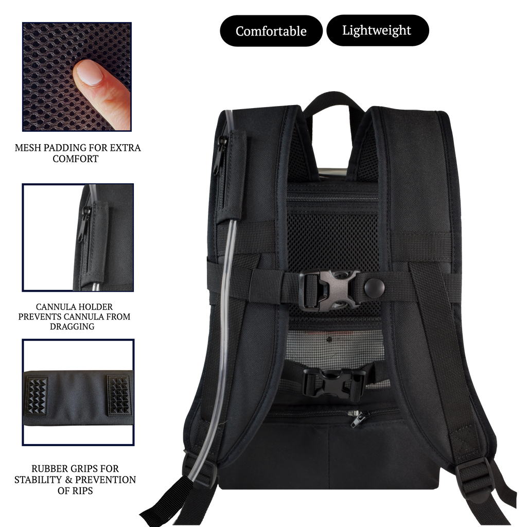 NON KINKING: Our patented velcro cannula system: Both sides of the backpack are aligned with velcro tabs that allow your cannula to escape freely without kinking.